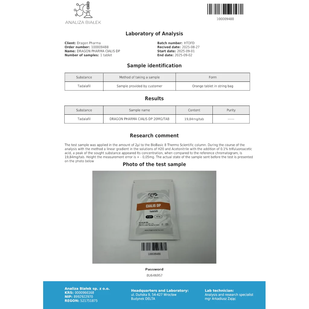 Dragon Pharma’s Cialis aimed at stimulation of the blood pressure in the genital area, Cialis tablets have immediate effect in the human body and creates the ideal conditions for the development of a natural erection.